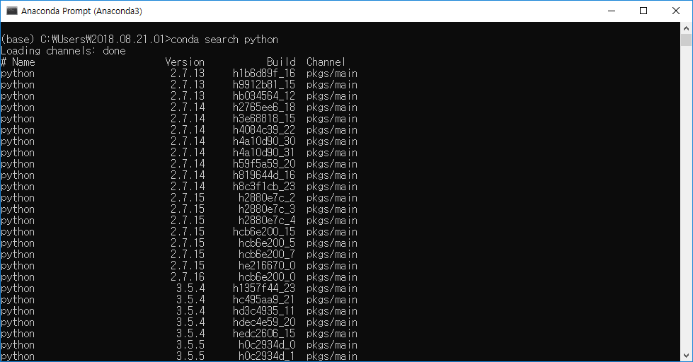 Conda serach python 명령어를 치면 설치 가능한 python 버전을 확인할 수 있습니다.
