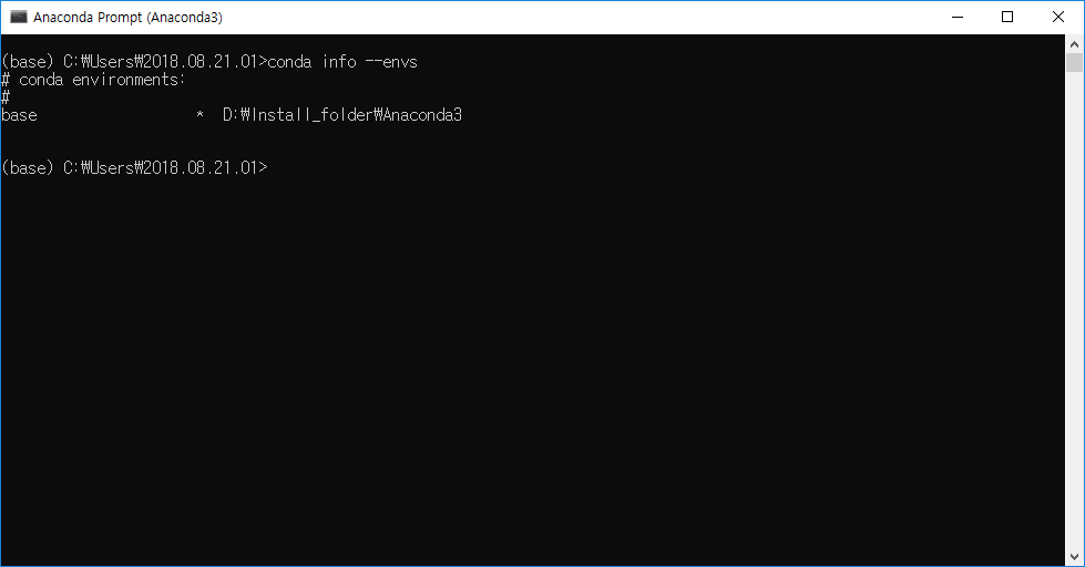 먼저 위의 그림과 같이 conda info --envs라는 명령어를 치면 가상환경 목록이 나옵니다.