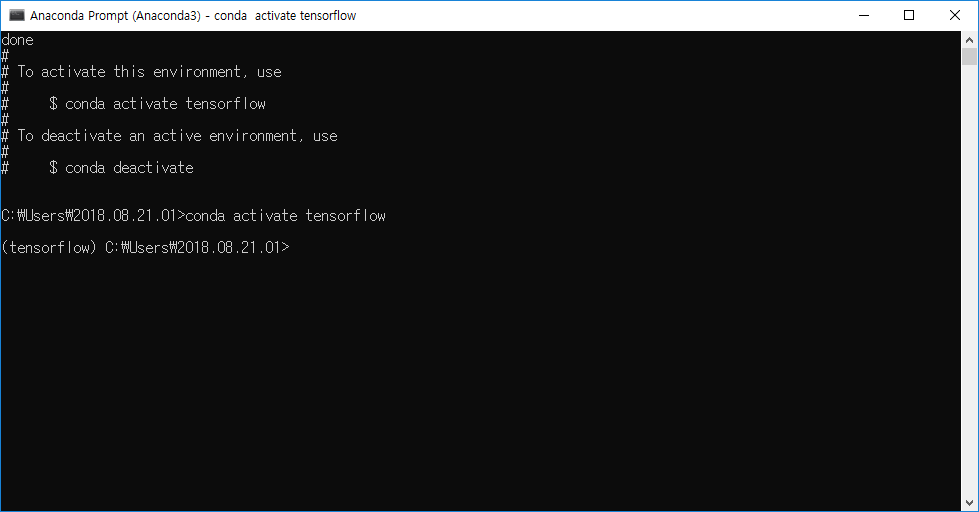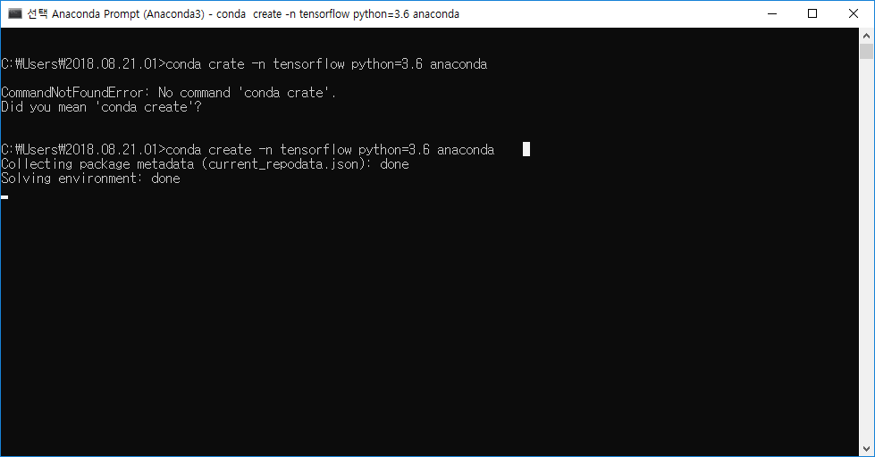 아래의 그림과 같이 conda create -n tensorflow python =3.6 anaconda 라고 타이핑 하자