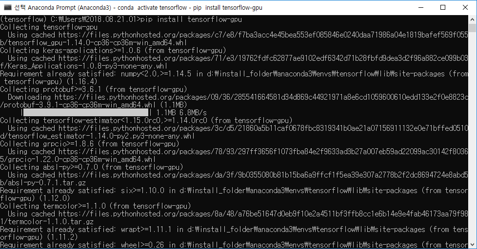 인제 pip를 이용해서 tensorflow -gpu 및 필요 라이브러리들을 설치하면 됩니다.