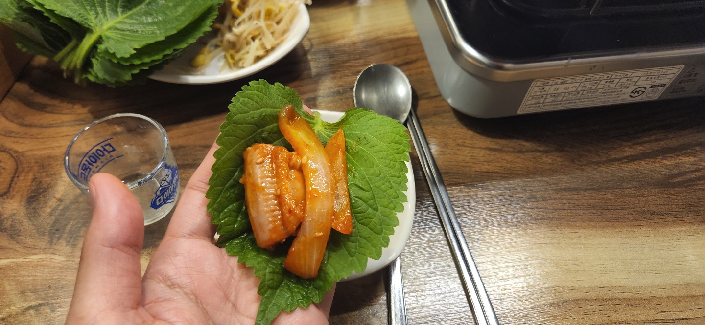 이렇게 꼼장어 올리고 양파도 올리고 쌈장 듬북 묻혀서 깻잎과 같이 먹으면 맛있답니다.