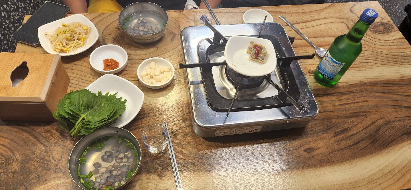 대첩국을 주는데 이게 맛이 또 끝내줍니다. 술 한잔 안들어갈수가 없죠?