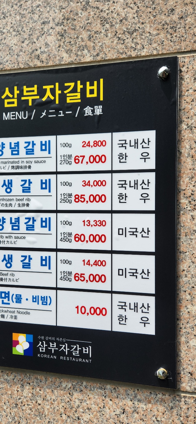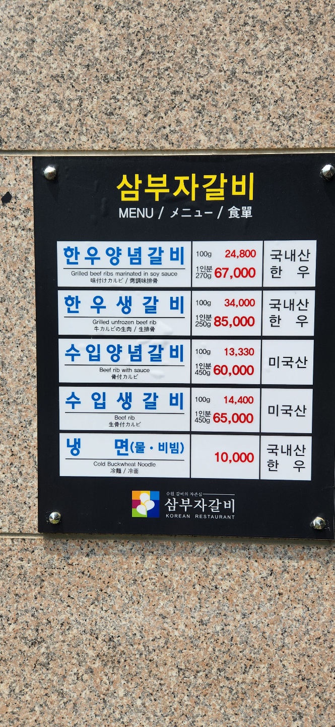 삼부자 갈비집 벽면에 가격표가 붙어있더라고요.