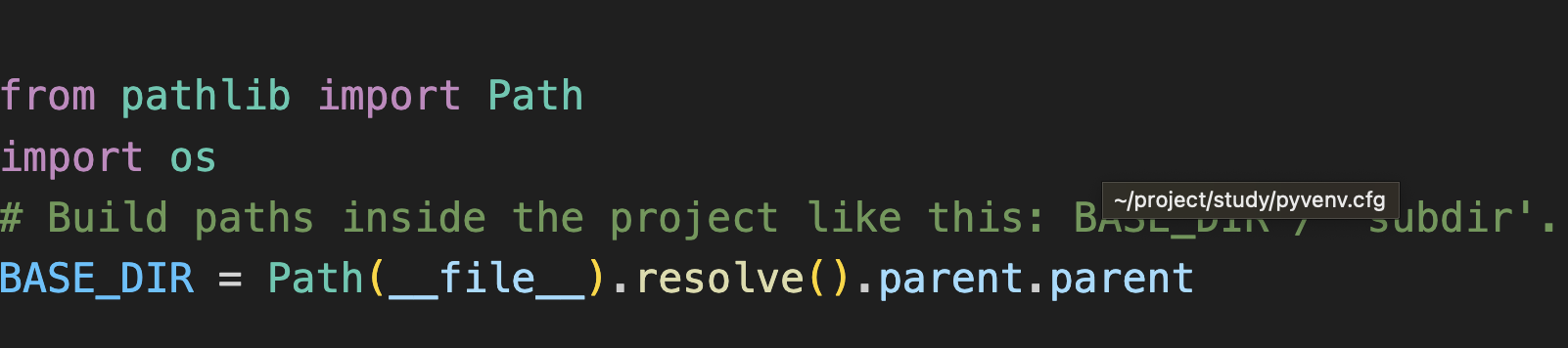 BASE_DIR에 대해서 써있죠? Path를 통해서 현재 폴더의 부모의 부모 폴더, 즉 내 프로젝트 폴더가 되겠네요.